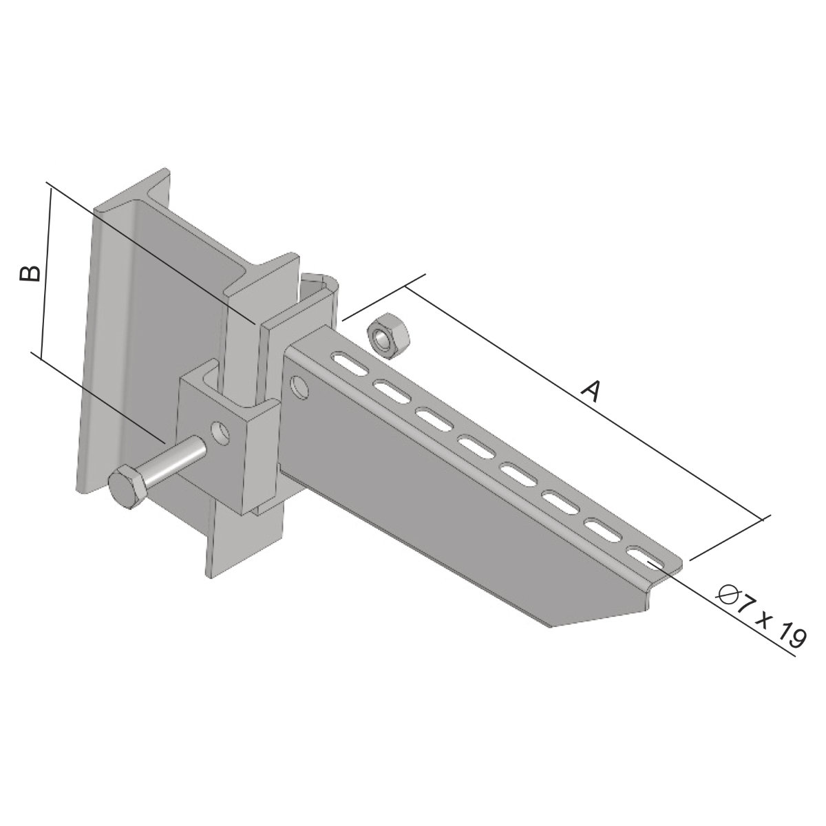 Set up for installation on the ceiling profile SPT and on Iprofile 80 mm. Tripping steel square, nut and crew S 8X20 are included. Cable tray attaching to the bracket is carried out by bolts NSM 6X10.